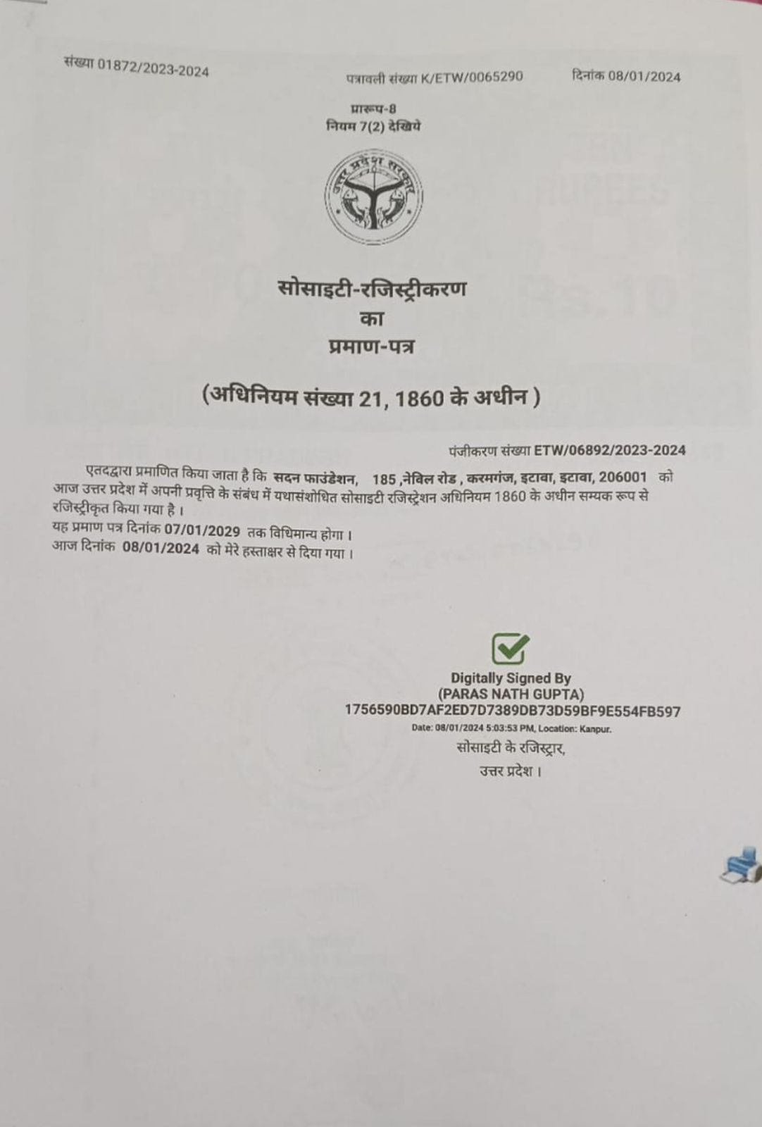 You can view and download the official certificates and important documents of Sadan Foundation from this page.